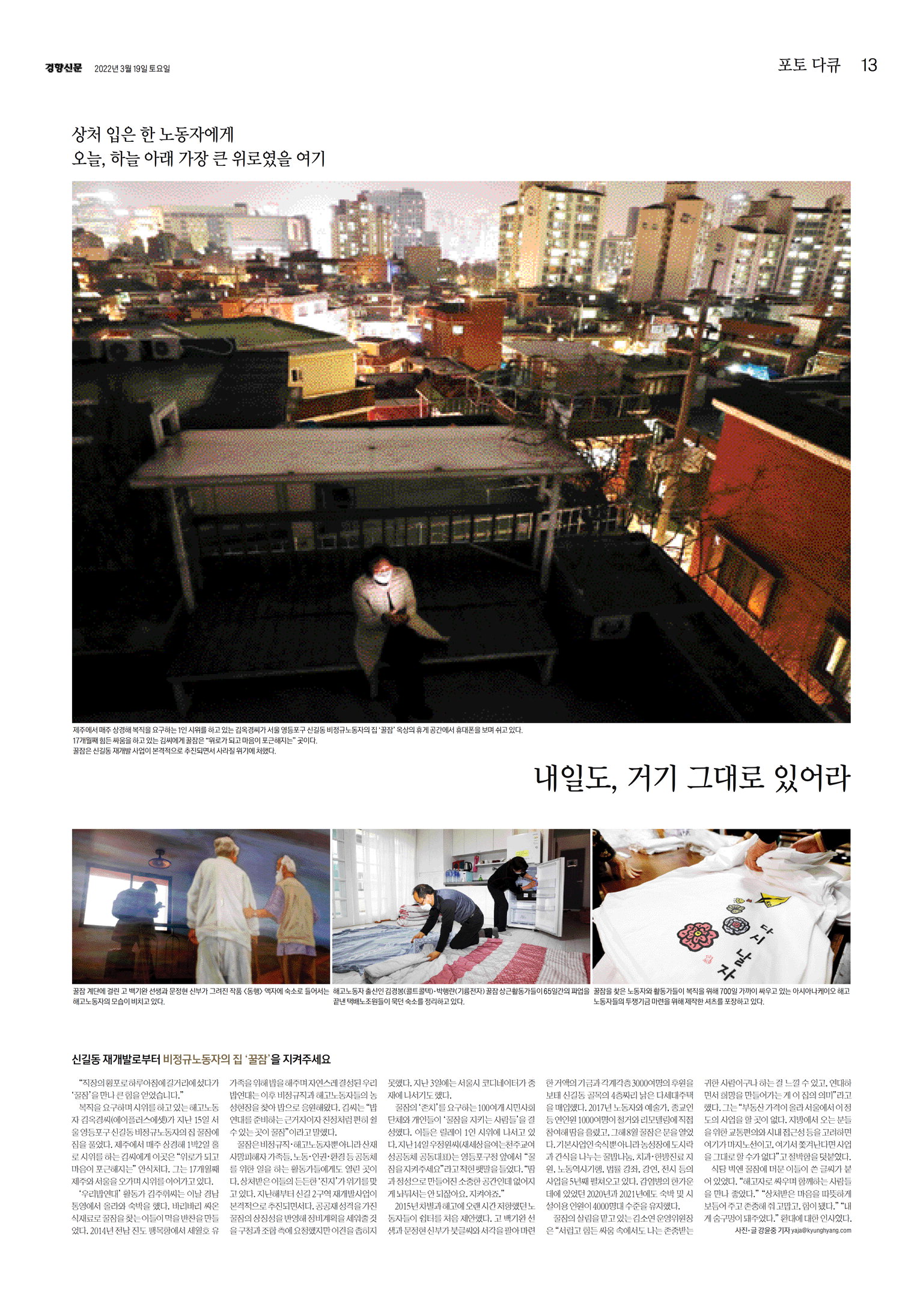 이거다 싶은 소재가 떠오르면 다른 소재로 전환이 잘 안 됩니다. 꿀잠이 그러했습니다. 유연하지 못한 것도 이유지만, 비정규노동자의 집이자 쉼터인 이곳을 짓는 과정부터 사진을 찍었기 때문입니다. 수많은 사람들이 십시일반 후원한 기금으로 낡은 주택을 매입했고, 공사비를 아끼기 위해 노동자, 예술인, 종교인 등이 철거와 리모델링에 재능과 땀을 기부했습니다. 취재하러 갔다가 저 역시 땀을 보탠 1인이 되었습니다. 2017년 지어져 지난 5년 간 참 많은 이들이 위안과 힘을 얻었습니다. 의미 있는 사업들도 자리를 잡았습니다.