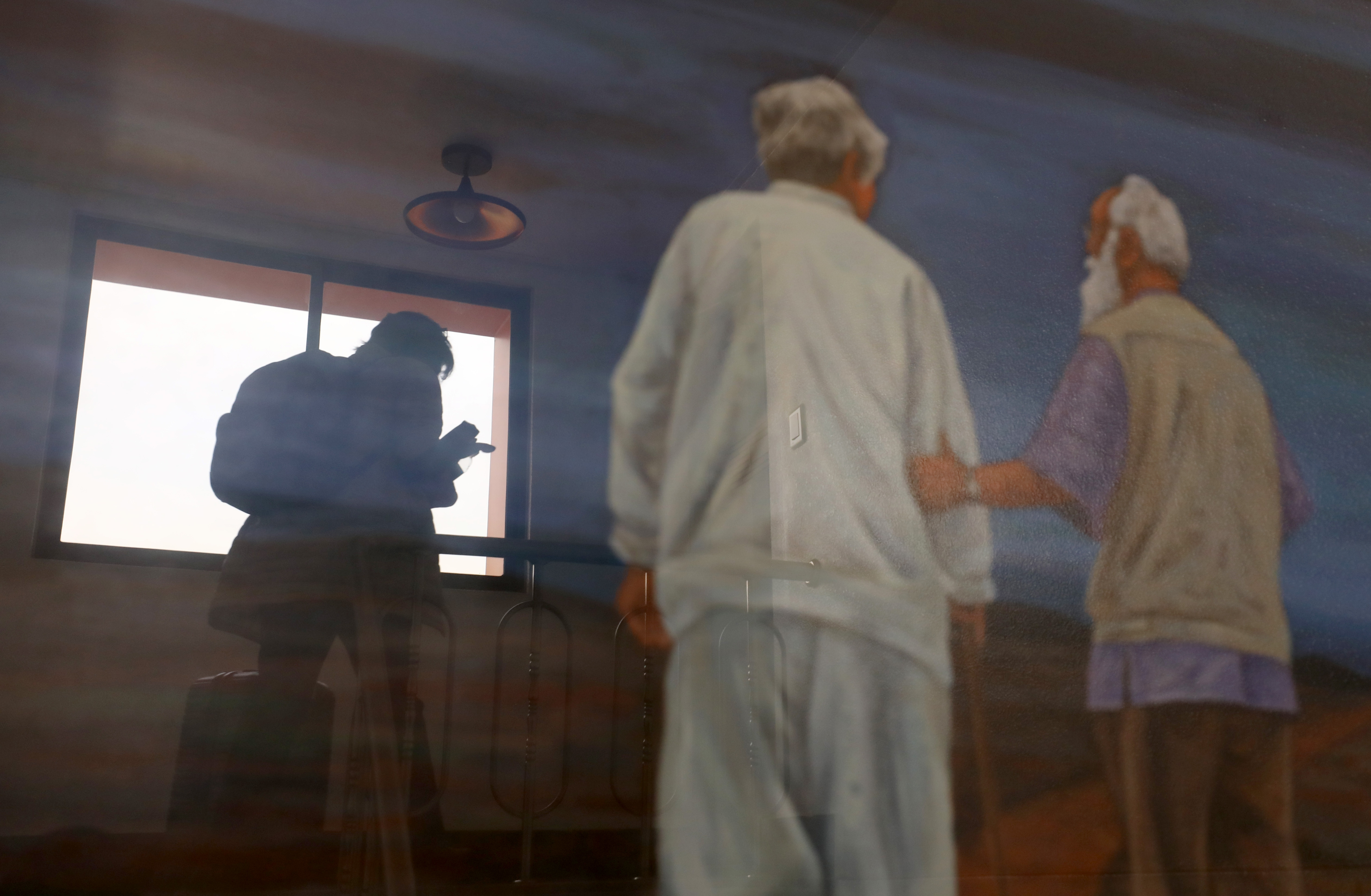 다른 한 장은 꿀잠을 짓는데 앞장 선 ‘두 어른’ 고 백기완 선생과 문정현 신부가 함께 길을 걸어가는 그림 액자에 비친 노동자의 모습입니다. 계단에 걸려 있는 액자의 한쪽 부분에 오후 햇살이 들어오는 창틀 모양의 새겨졌고, 꿀잠을 찾은 이가 지나가는 실루엣을 노려서 찍은 것이지요. 그림의 제목은 <동행>이었고, 꿀잠의 존재 의미를 함축하고 있다고 생각했습니다.