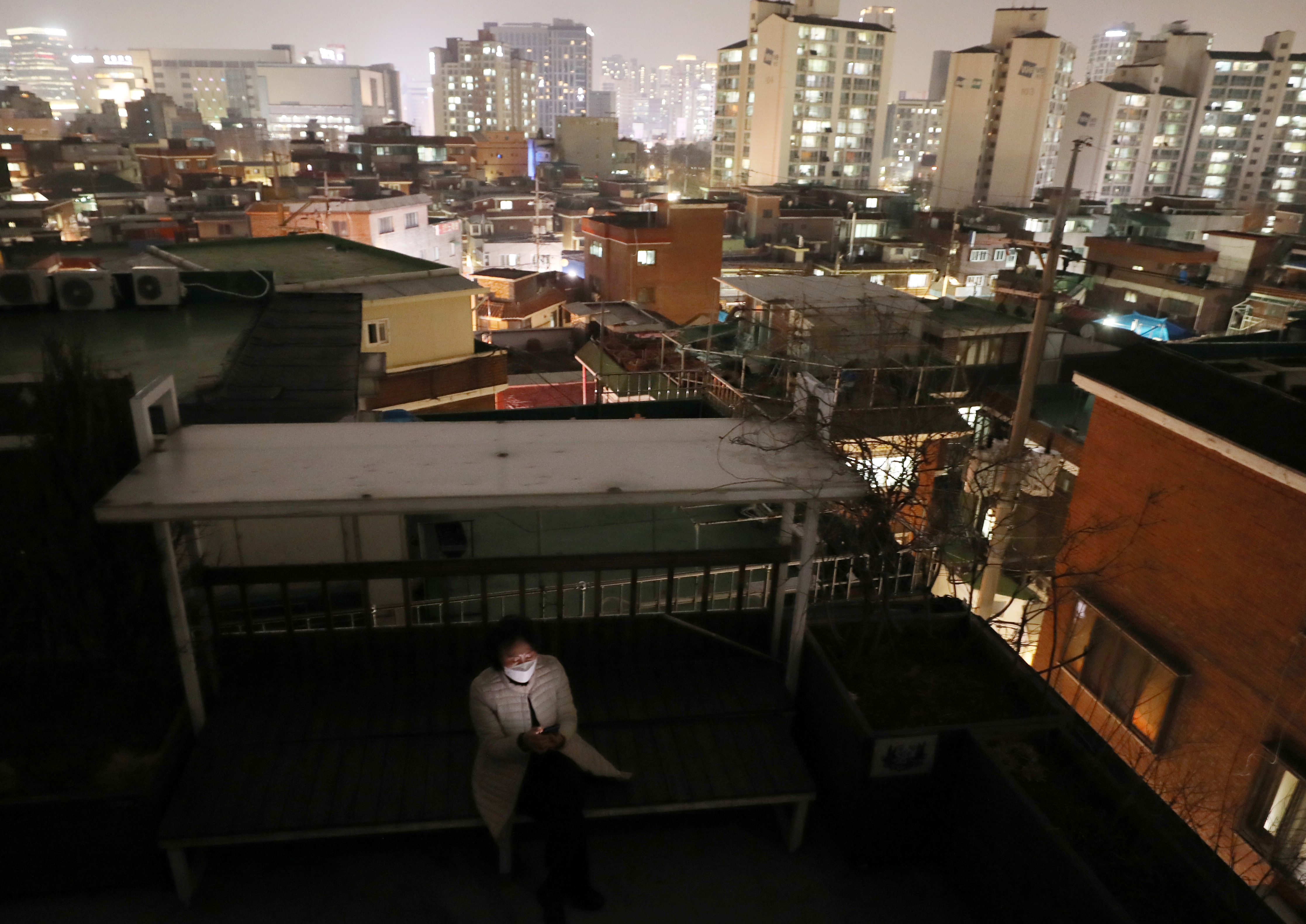 취재 마지막 날 찍은 사진 두 장은 그 방향에 어느 정도 부합한다고 생각했습니다. 메인 사진 후보로 고른 사진들입니다. 하나는 해지고 어두운 꿀잠 옥상 휴게실에 앉아 휴대폰을 들여다보는 해고노동자의 모습입니다. 꿀잠 주변 재개발이 예정된 신길동의 어둠과 아파트 불빛이 가득한 원경의 대비를 고려했습니다. 휴대폰 불빛에 구조와 연대의 요청이라는 의미를 부여했습니다.
