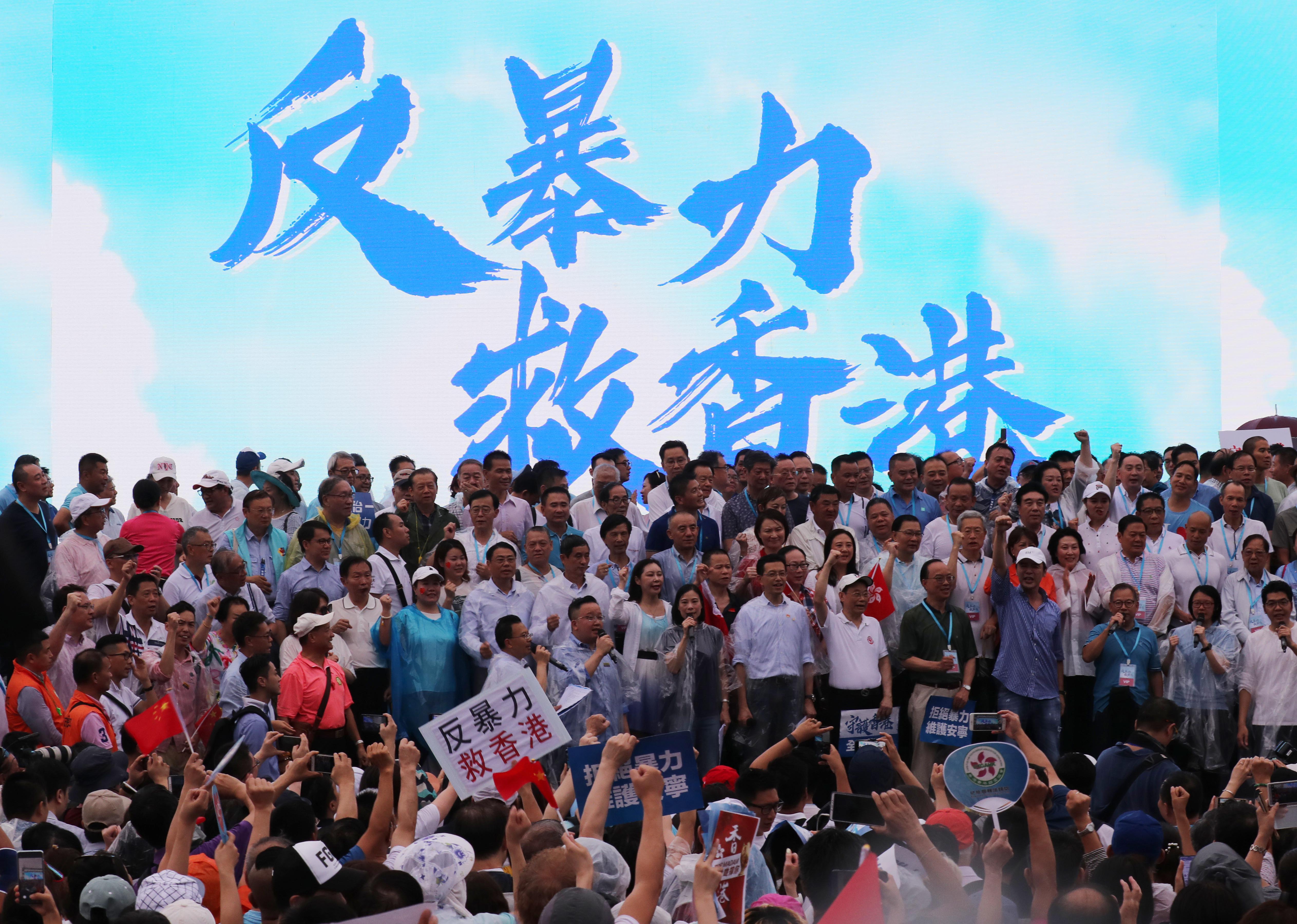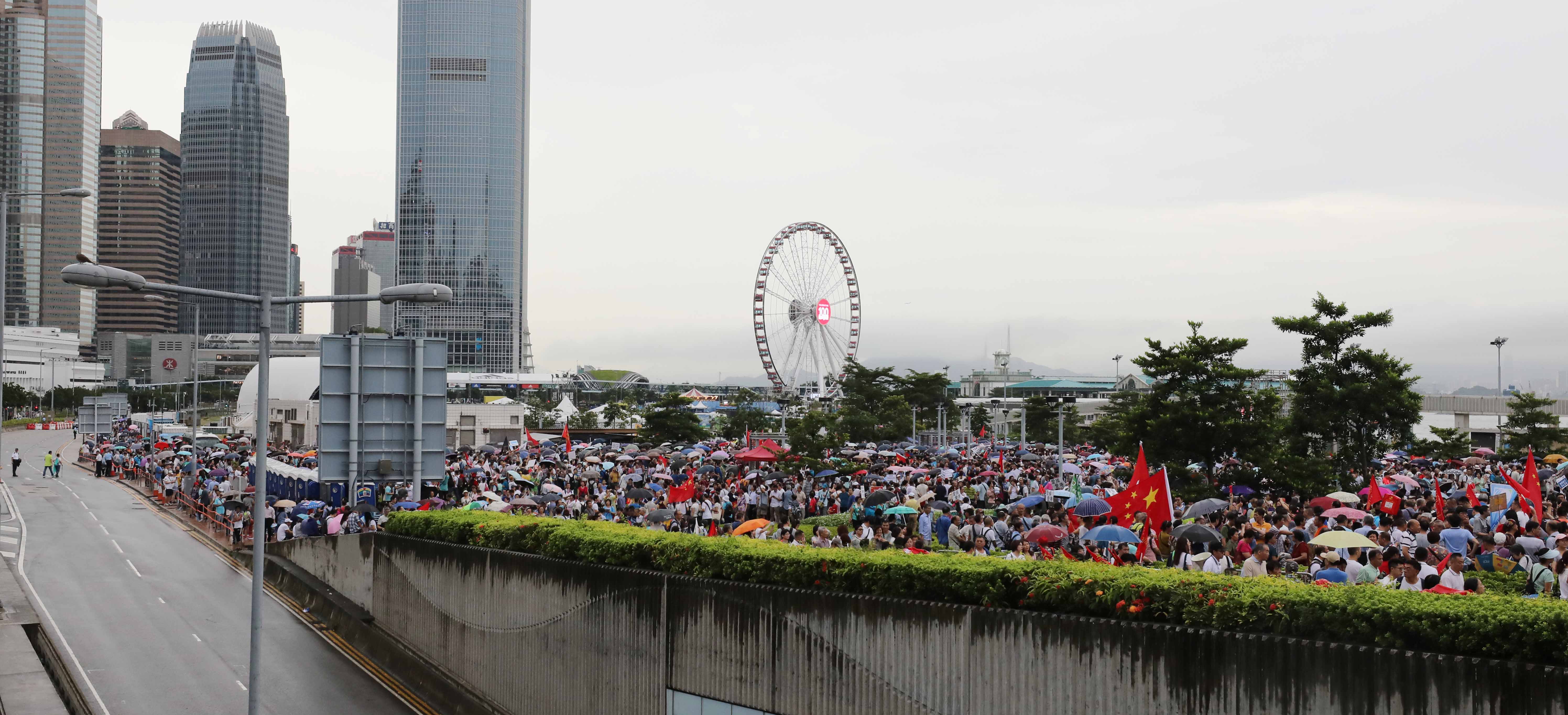 다음날 송환법(범죄인 인도법안)을 반대하는 대규모 시위취재를 앞두고 현지적응이라도 할 요량으로 오후에 예정된 집회현장에 가기로 했습니다. 먼저 간 곳은 홍콩정부와 경찰을 지지하는 집회 즉, 송환법을 반대하는 시위를 반대하는 집회입니다. 곳곳에 오성홍기가 나부꼈습니다. 뭔가 익숙한 ‘오성홍기부대.’ 참가자들은 "폭력을 멈추고 질서를 회복하자”는 등의 목소리를 높였습니다. 맞불집회인 셈이지요.