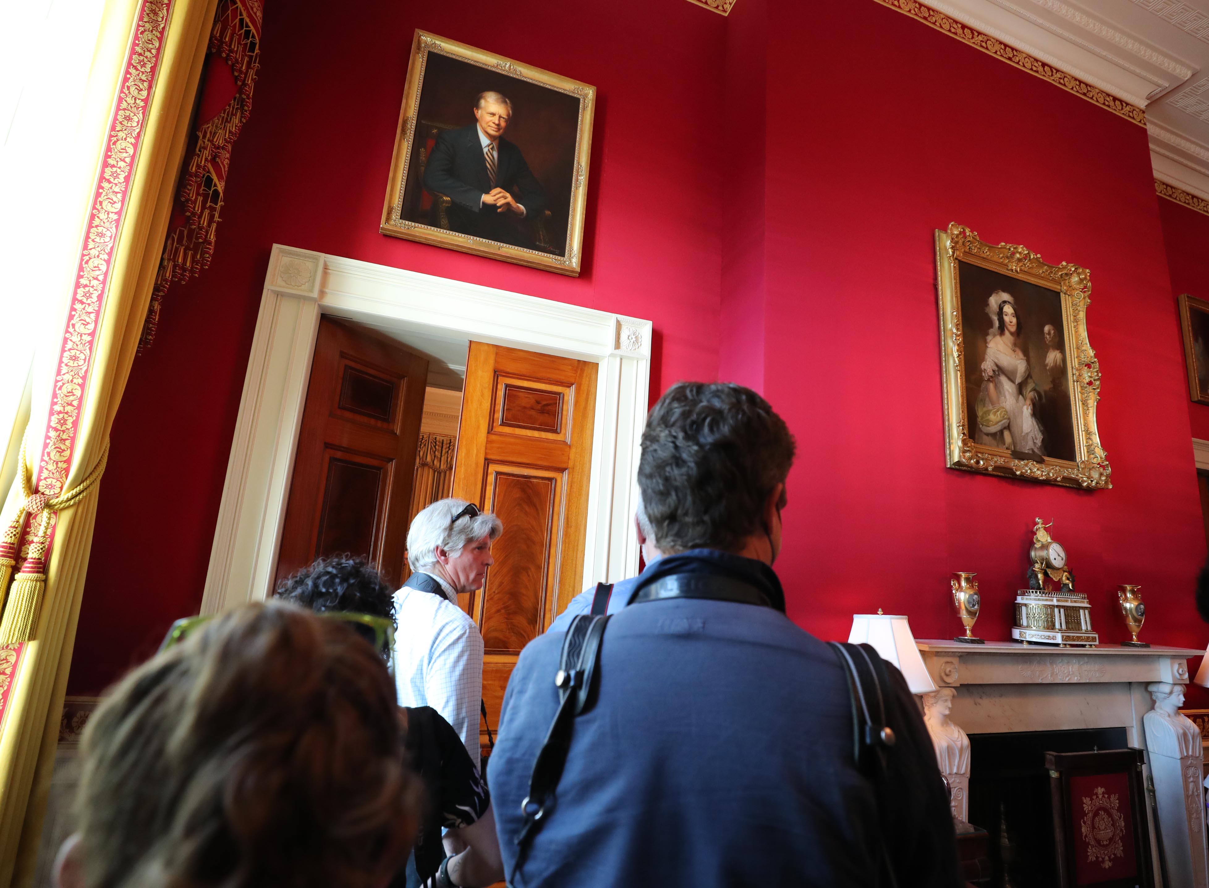 닫힌 문 너머에는 한미 양국의 정상들과 참모들이 회담을 열고 있었습니다. 우리나라에서는 대개 회의가 시작되기 전에 기자들이 먼저 자리를 잡지만, 이곳에서는 회의 중에 잠깐 문이 열리고 기자들이 들어가 취재하는 방식이었습니다.