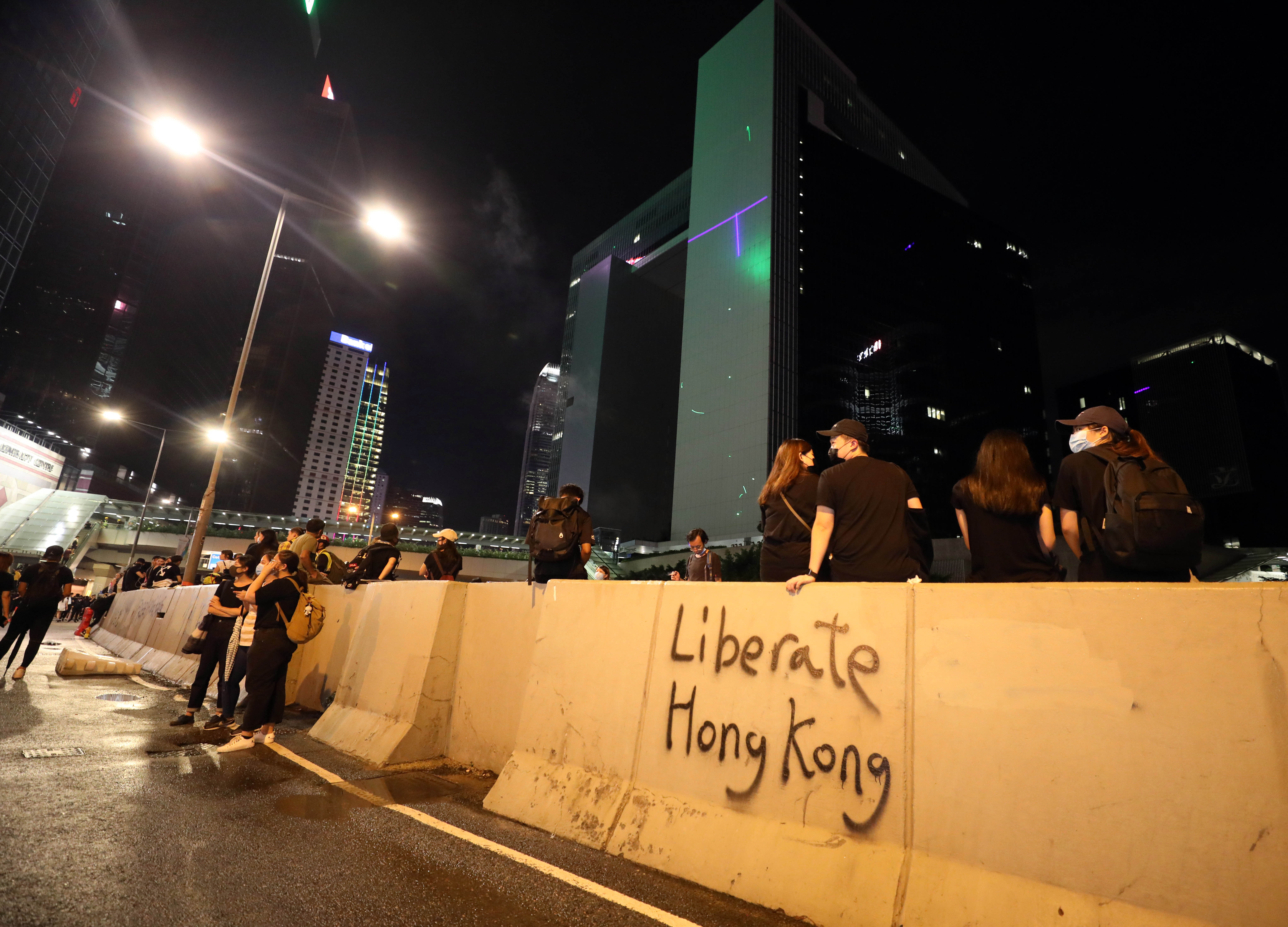 언제나 늦게까지 남는 건 체력 좋은 청년들. 정부청사 건물 앞에 청년들이 모여들었습니다. 충돌가능성이 있다면 그 곳 뿐이었지요. 청년들은 청사를 둘러싼 대형 바리케이드에, 아스팔트에, 벽에 외치던 구호를 영어와 한자로 그려 넣었습니다. 일부는 레이저포인터를 정부청사, 경찰청사 건물에 쏘아대며 야유하고 또 환호했습니다. 이날 경찰은 어디에서도 모습을 드러내보이지 않았습니다.