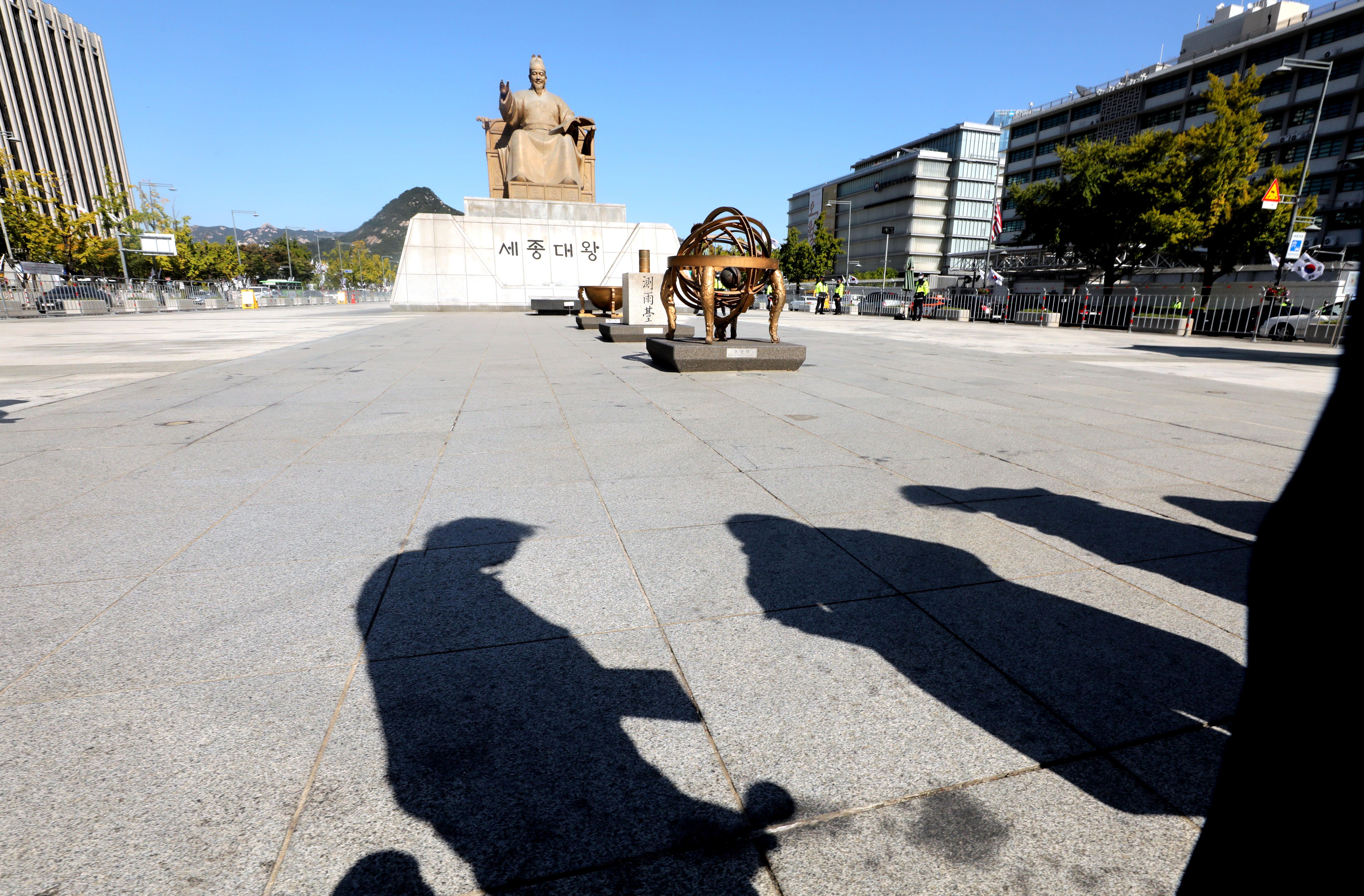 귀찮은 숙제를 누가 대신해준 것처럼 행복해져서 광장 바닥에 시선을 던졌습니다. 다행히도 그림자는 현수막을 들고 선 회견 참가자들 뒤로 드리워졌습니다. 광각렌즈를 들고 쪼그려 앉으니, 저만치 뒤로 세종대왕상도 친절하게 앵글에 들어왔습니다.